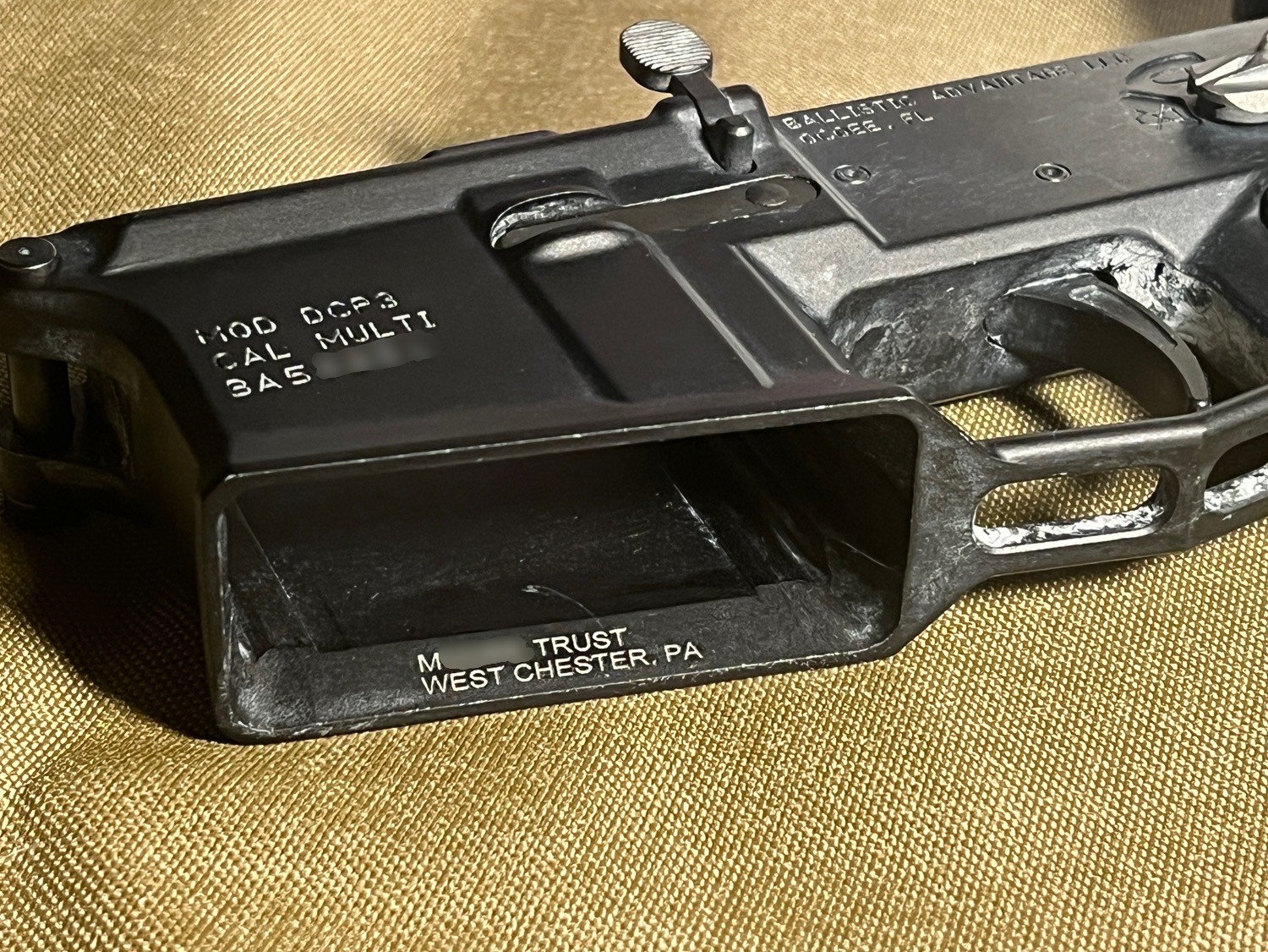 Unfair Advantage Tactical employs laser engraving technology to exceed the ATF marking requirements for engraving a firearm, receiver or parts. The ATF requires that all Form 1 short barreled rifles, shotguns or silencers be engraved with the manufacturer’s name (you or legal entity), city and state. Your Name / legal entity name and locale can be engraved any where it is visible and can be as small as 1/16″ in height. The minimum depth required by the ATF is .003″, we will always engrave deeper so it wont be covered by coating or paining in the future. We are happy to engrave anywhere on your firearm that is visual e without disassembly and our laser has a straight shot at.
